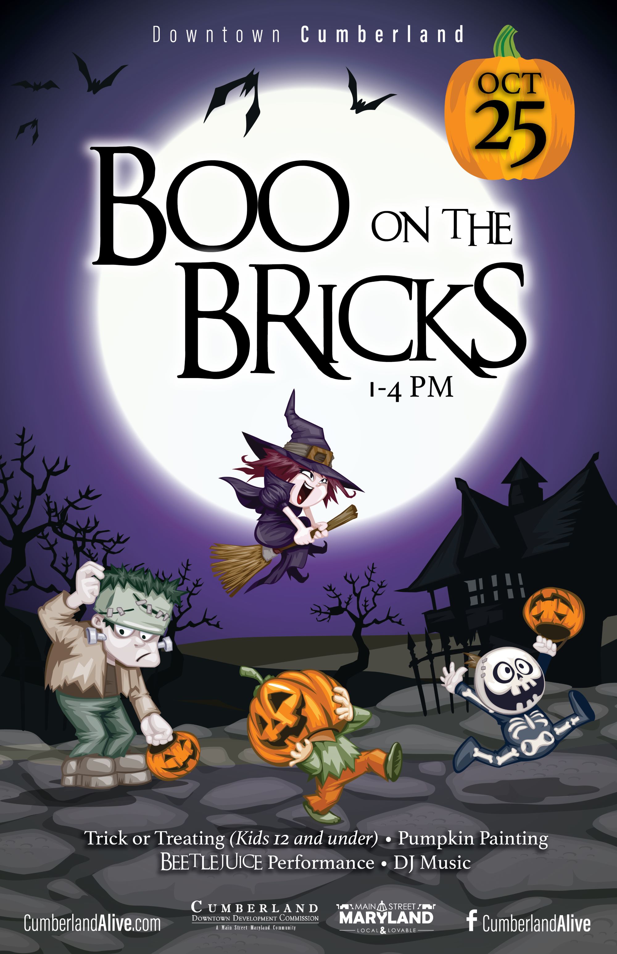Downtown Cumberland will hold Boo on the Bricks on Saturday, October 25th from 1-4pm! Enjoy trick or treating (kids 12 and under), pumpkin painting, a Beetlejuice performance, and music by a DJ!